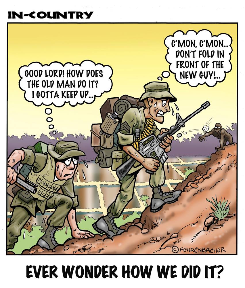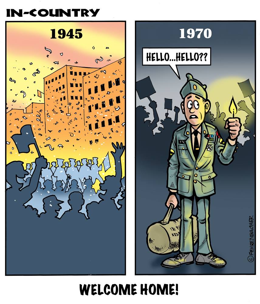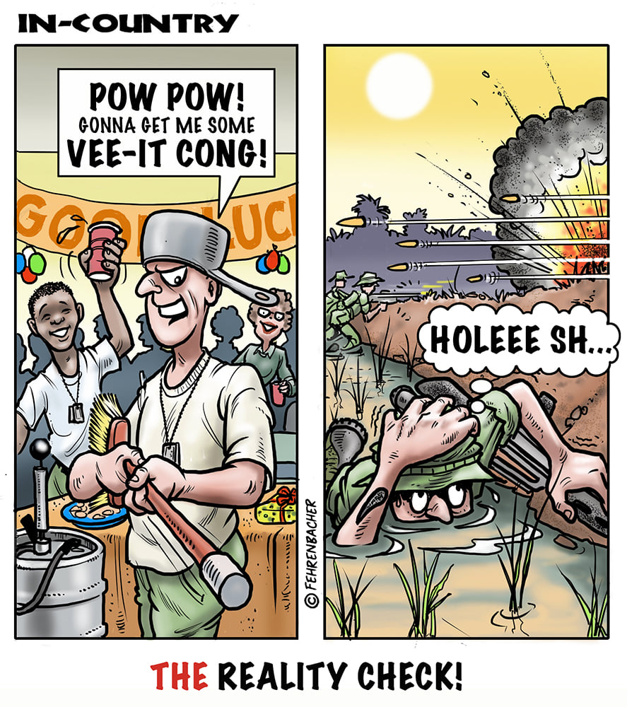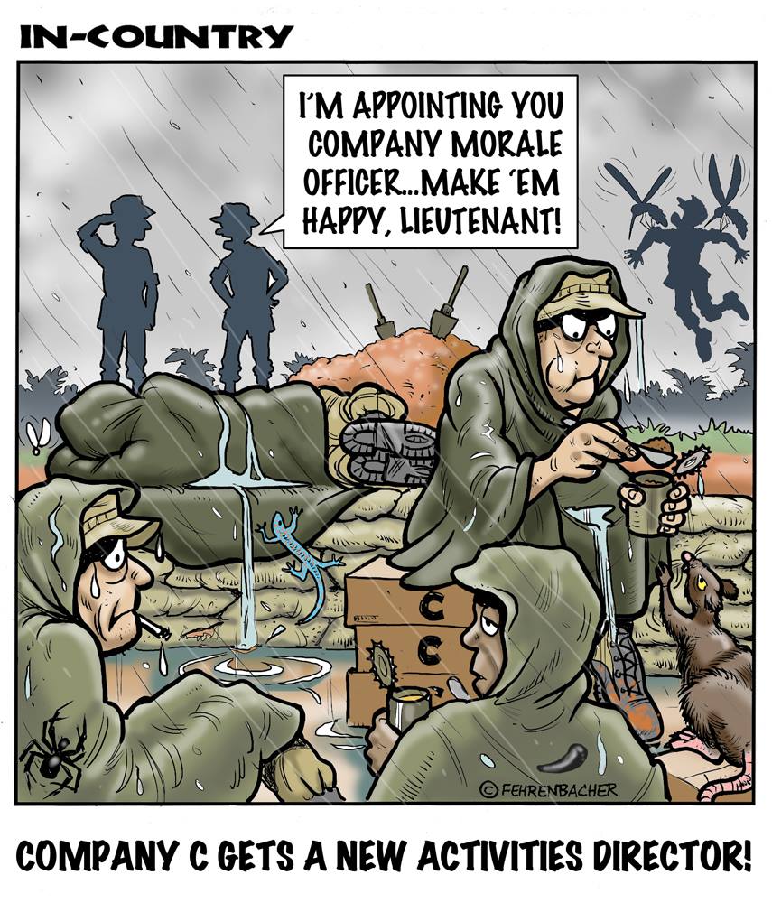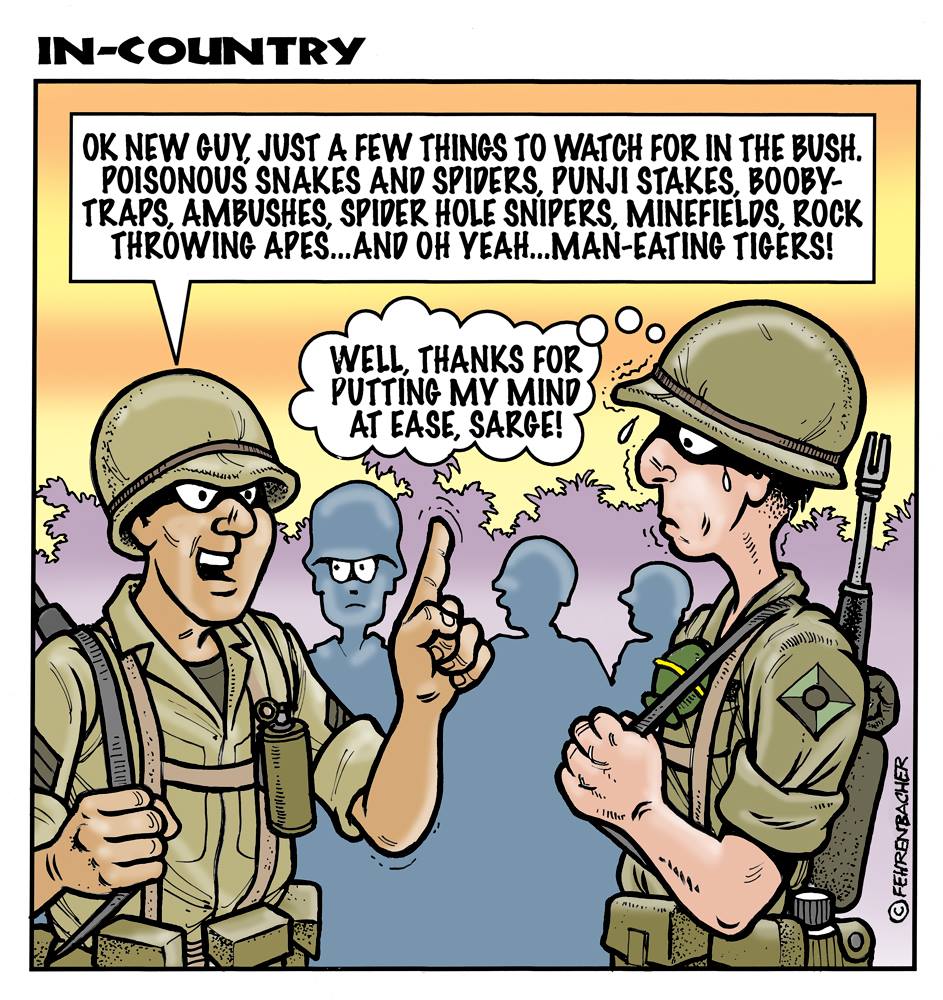Phil enlisted in the Army in 1965 where he served for years in Vietnam. He became a graphic designer and has worked for the state of Oregon for 26 years. He retired in 2003 and started the Cartoon "In-Country". The cartoons reflect his experiences during his tour of duty in South Vietnam.
